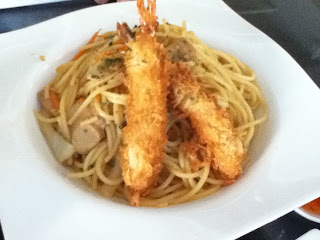 天婦羅蝦燒汁意粉﹕兩隻天婦羅蝦從佢唔均勻,亦唔金黃嘅外皮色水黎睇,應該係焗嘅。好處係比油炸少油,比較唔油膩。好彩皮都夠脆,較油炸乾身。但內餡就一般,炸皮太厚,炸粉仲厚身過隻蝦,而且蝦粉粉地,完全唔爽口,似乎買料唔夠眼光。意粉同香蒜海鮮意粉嘅基礎都係一樣,有菇、有蘿蔔絲,只係無左蒜味,換左做燒汁。但燒汁極少,落左都唔多覺,需要用極敏感嘅舌頭,先可品嚐到丁點嘅燒汁甜味。加多兩湯匙呀,唔該。