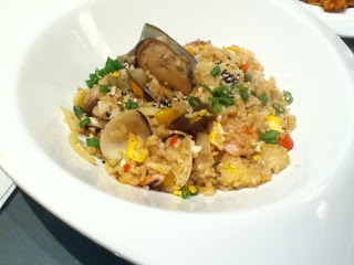 一百蚊一碟炒飯,材料夠派頭,有大大隻青口、N咁多隻爽口彈牙嘅鮮蝦、多條煙煙韌韌嘅魷魚鬚,仲有無數咁多粒新鮮蜆肉。材料足之餘,炒飯亦唔錯。炒得夠乾身,蛋香味十足,再加埋唔少青、紅、黃椒粒,以及洋蔥粒伴炒,最後仲有些少芝麻提味,成碟炒飯只論香氣,已經值一百分。色彩吸引,味道亦可口,讚!