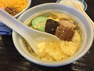 定食包括一碗茶碗蒸及三色飯,賣相非常靚。主角茶碗蒸好幼滑,表面同中間都無氣泡,成碗都蒸得好靚。入口更加不得了,蒸蛋雖然呈固體狀,但佢嘅柔軟度直情近似於濃湯。入口即化,蛋液自然滑入喉嚨,口感就好似薑汁撞奶一樣。食得出蒸蛋用上好多高湯,湯頭非常鮮味濃郁,無添加過份調味。加上好多高級配料,如白肉魚、雞肉、香菇、木耳、蝦、銀杏、魚板、烤星鰻等,非常豐富。無諗過茶碗蒸可以如此講究,如此美味。至於三色飯,三色配料係蛋絲、櫻花蝦鬆同雞肉鬆。賣相吸引不在話下,仲相當好味。味道偏甜,正好下飯。