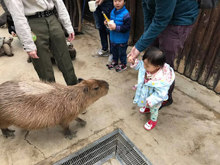 動物國王分為內園同外園,呢度最出名就係有好多小動物走街行俾你任摸。剛開園人少少先去入門級同小兔玩下。初頭紫凝都驚驚地,慢慢捉住佢手摸下啲毛毛,就覺得好得意,之後仲周圍追住啲兔玩。