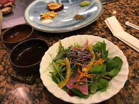 前面係A5嚴選牛沙朗、後面係A5神戶牛臀肉。一睇啲油花就覺得高級。套餐包括餐湯忌廉湯,沙律,配飯或餐包。碟上已放上調味料,有炸蒜片、海鹽、黑椒、Wasabi。