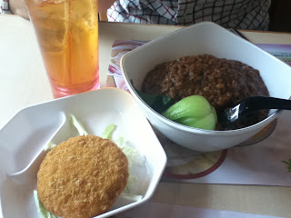 兩點鐘未有下午茶,叫住個午餐頂住肚。 一塊圓轆轆嘅炸雞扒,一咬開啲芝士就湧出黎。細看之外,原來係兩塊薄薄嘅雞扒,中間夾住芝士同火腿,再裹上炸粉油炸。流心雞扒外皮炸得脆卜卜,好香口,但肉質粉粉地,唔太似雞扒。中間嘅芝士同火腿就好好味,熱辣辣嘅芝士味道勁濃,加埋火腿更加惹味。食完成塊雞扒都唔覺油膩,想一試再試。流心雞扒配肉燥飯,相當有意思。肉燥份量澎湃,舖滿晒飯面,唔會好似一啲食肆,飯就一大碗,肉燥就得一細湯匙。肉燥份量多之餘,味道亦唔錯,有麵豉、醬油嘅味道,肉碎非常入味,仲有些少冬菇、洋蔥等材料,撈飯一流。蜂蜜綠茶味道正常,如果再濃郁啲就好啦。
