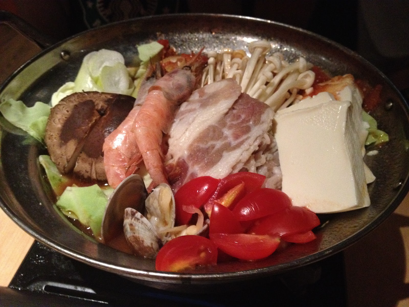 有牛肉片、蝦、青口、蔬菜等,加上蕃茄湯。食晒材料之後,加上芝士同飯一齊煮,成為茄汁香濃嘅意大利飯。熱辣辣幾好味,而且幾有心思,絕對夠飽。