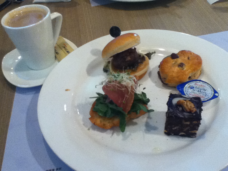 淺啡色圓圓嘅係英國鬆餅。記得早前食KFC嘅早餐,都鍾意配佢嘅蜜糖鬆餅,貪佢甜甜地,做早餐甜品都唔錯。而呢件下午茶鬆餅,外型明顯靚仔過KFC,表面光滑,隠約見到有粒粒提子乾。非常鍾意佢嘅口感,外層少少脆口,內層鬆化,有好香嘅蜜糖同牛油味,配搭甜甜酸酸嘅提子乾,真係好味。