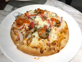千島醬蟹捧蟹子帆立貝薄餅 $68 Pizza大約六吋左右,原身餅底,面層舖滿海鮮料,賣相非常吸引。熱辣辣,芝士半融,帆立貝都幾新鮮,仲有蟹子、蟹柳等,味道不錯。