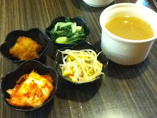 所謂嘅前菜,係韓式四小碟凍食小點,都係啲醃製嘅開胃小食。得四粒仔嘅甜薯仔味道唔錯,似係用微辣嘅醬燒汁煮過再雪凍食,薯仔好甜,口感粉粉,好開胃。而白菜苗就無乜特別,只係蒜蓉炒白菜,勝在白菜唔會苦。泡菜味道好香,醬汁濃郁,微微酸,多多辣,但辣得黎唔會令人抗拒,反而越食越上癮。大白菜好爽口,裡裡外外都吸收晒醬汁,非常滋味。大荳芽菜,用麻油調味,簡簡單單。