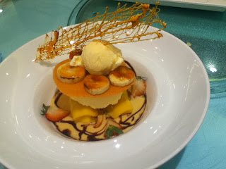 取名參考台北101大樓,千層酥究竟有幾高? 上枱嘅時候的確驚喜,八、九層千層酥再加一塊長長嘅糖膠片,淨係件千層酥都有成二十厘米高。千層酥放喺大大隻碟上,仲有糖絲伴碟,賣相一流。但問題就黎啦,點樣可以分到人人都有食,而又不損千層效果呢? 最後決定將佢上下分一半,再切開幾份。每層酥皮中間用吉士醬分隔,再加上奇異果、火龍果、蜜瓜、藍梅、西瓜等水果。水果嘅款式似乎過份新奇,紅色嘅竟然唔係士多啤梨,而係西瓜。而吉士醬實在太少,所以味道比較寡,但酥皮的確超級酥脆,每層酥皮都睇得出由十幾片薄皮組成,非常鬆化。