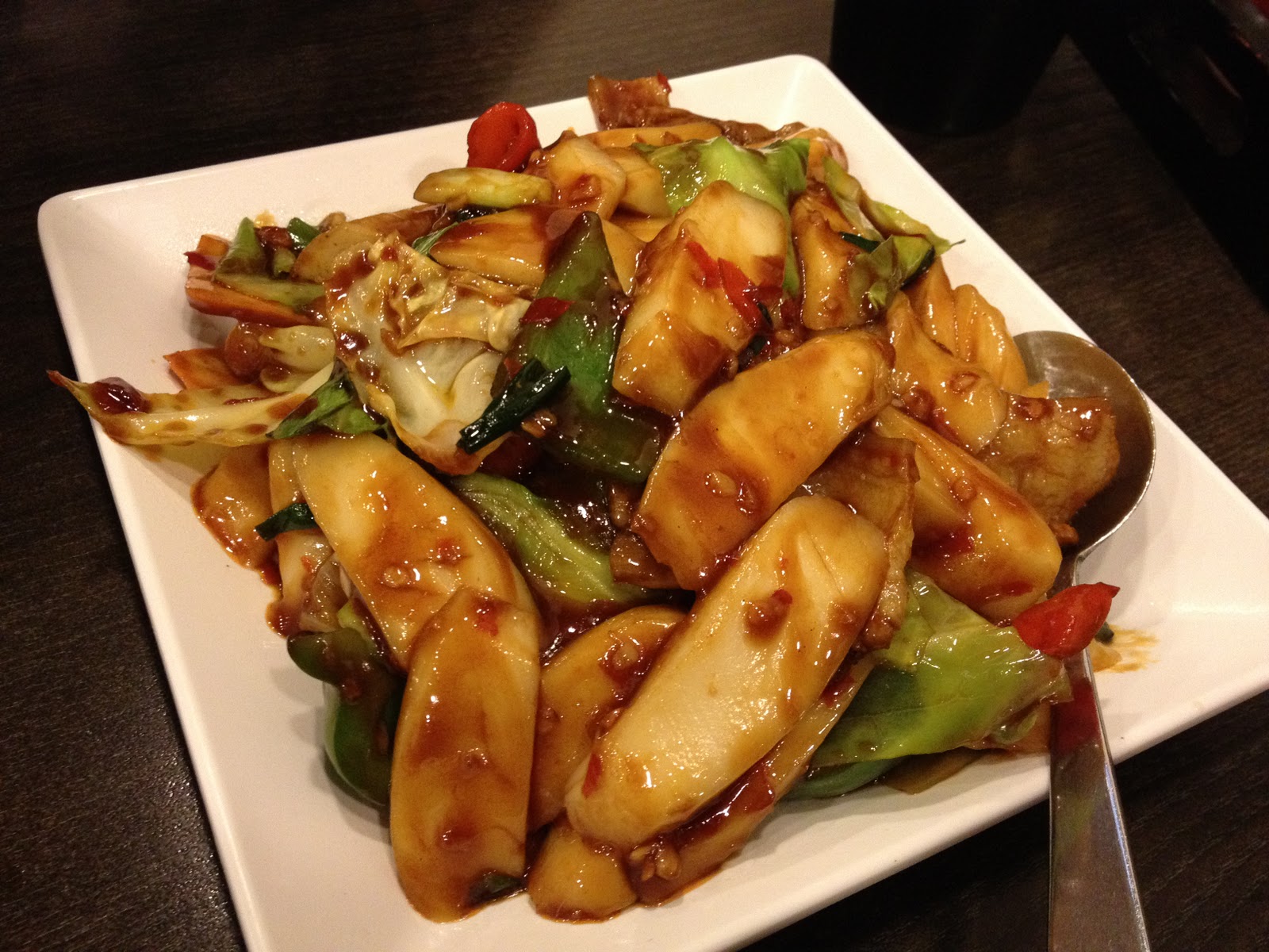 炒年糕醬汁非常濃厚,材料豐富,賣相好吸引。年糕厚薄適中,煮得煙煙韌韌,質地剛好。記得試過幾次唔掂嘅年糕,勁硬實、咬到牙軟又有,熟到過晒火位,腍到不似年糕又有,但呢個年糕真係控制得唔錯,而且越食越食到米香。年糕配料有椰菜、冬菇同豬肉等。豬肉係五花腩,切得比較厚身,稍為硬左少少,幸好醬汁入晒味,而椰菜都吸收晒醬汁。年糕用濃郁嘅醬油同蒜等伴炒,亦帶濃烈嘅豆瓣醬甜辣味,炒得好夠夠鑊氣,非常惹味。