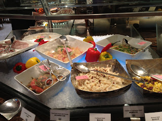 餐廳內有幾個熟食專櫃,提供燒羊脾、即製海南雞飯。仲有串燒燒烤檔,有串燒牛舌、雞翼、雞軟骨同各式蔬菜。中式點心部有小籠包、燒賣、餃子等點心。另外仲有十幾盆熱食,選擇唔算多,有咖哩、蔬菜、燉肉、幾款炒粉麵飯,仲有一中一西餐湯配麵包。