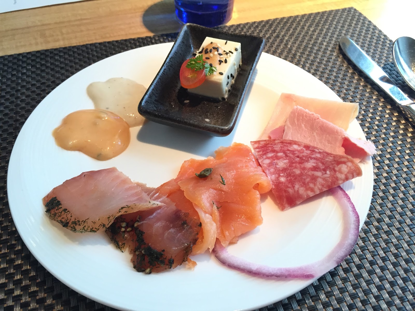 冷盆有煙三文魚、凍牛展、日式凍豆腐、番茄水牛芝士、凍火腿拼盆。