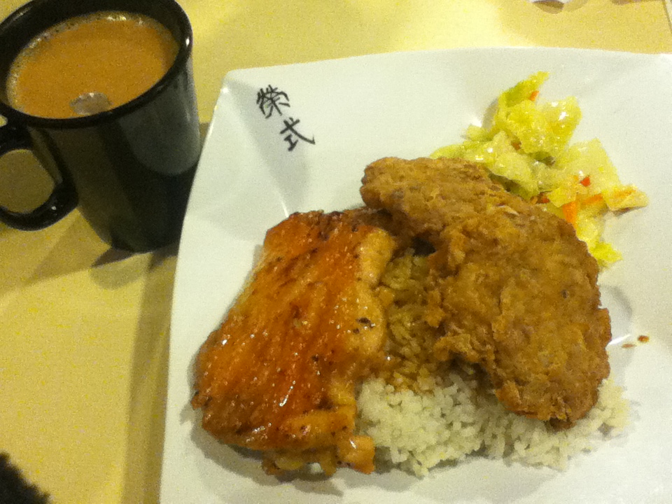 黎到呢度,叫招牌雞扒係指定動作,第一份叫左雞扒拼豬頸肉飯。一大碟飯,一件雞扒,四片燒豬頸肉,仲有些少配菜。雞扒睇落同一般煎雞扒分別唔大,長長扁扁薄切一塊,惟一係多左幾條凹凸坑紋,始乎係放喺電爐黎個板燒。雞扒外皮呈金黃色,邊位微微燒焦,賣相相當討好。急不及待大口一咬,先發現魔力來源。原來金黃色嘅雞皮非常香脆,今餐就放縱一下,千萬唔好計較卡路里或膽固醇,一定要連雞皮一同送入口。熱辣辣、香噴噴嘅雞扒充滿肉汁,雞肉嫰滑鬆軟又惹味。似乎黑胡椒落得唔客氣,味道濃得黎帶點刺激,非常配合雞皮嘅蜜糖甜味,好有BBQ風味。雞扒都似係即叫即燒,基本上配得起所有「好味」嘅形容詞。但薄薄四塊嘅烤豬頸肉實在給比下去,感覺好普通,完全輪為配角。