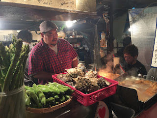 黃昏時間行經屋台區,好多店舖仍在準備中,黎到八點,相信正營業得如火如荼。因為屋台無地址,亦無確切地圖,好多時係行過見到得一間,都幾難搵。就係中洲河岸見到幾檔,可惜幾檔都唔太吸引,亦未見過有人介紹,決定行番去天神屋台區。就係大丸前,有幾間屋店已經企左人排隊,就決定去呢間廣有人介紹嘅小店一試。