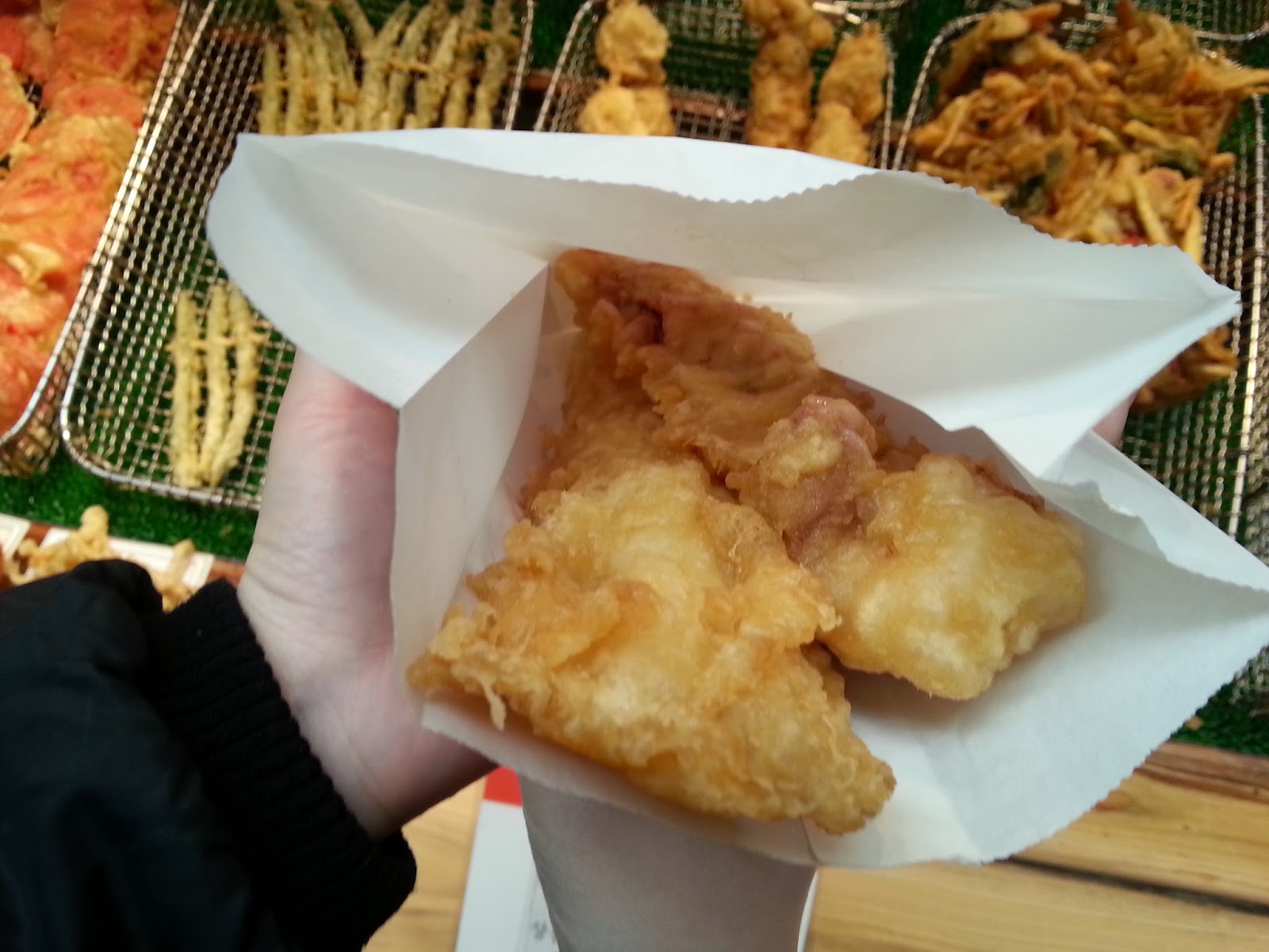 另一間必食名店係日進堂天婦羅,人氣名物係將全條鰻魚拎去做天婦羅¥500,鰻魚好厚肉,勁重魚味,炸粉唔厚,但保持香脆,認真不錯。另一件魷魚¥120都相當唔錯。