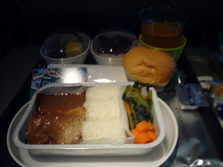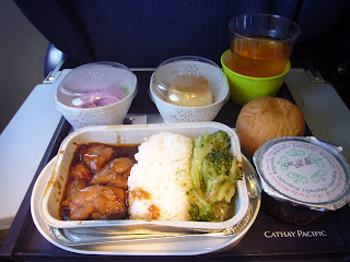 幾鍾意坐國泰,鍾意佢嘅飛機餐。是日空中午餐主菜﹕照燒雞扒飯、咖哩海鮮飯。照燒汁同咖哩都係甜甜嘅日式風味,配飯一流。配餐飲、餐包、櫻花冷麵、雞蛋布丁。加埋最鍾意的蘋果汁。