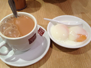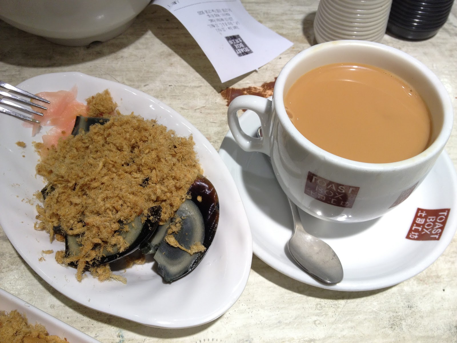 多士配上半熟蛋係新加坡餐嘅特色。跟據食用小貼士,打破左半凝固嘅蛋黃,蛋黃同純白幼滑嘅蛋白混和,加上醬油同胡椒粉撈勻,就係簡單美味嘅小食。